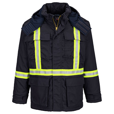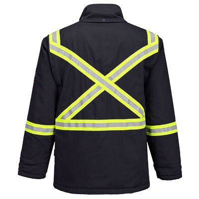 This Winter FR Jacket is perfect for the demands of the offshore industry. Constructed with 88% cotton, 12% nylon outer fabric and combined with an extra thick wadding insulation and FR cotton lining for extra warmth. This style also has high visibility yellow/silver/yellow reflective tape double stitched for enhanced visibility. Features include triple stitched seams, high visibility strips on shoulders, arms and body, concealed 2-way front brass zip and 5 pockets.