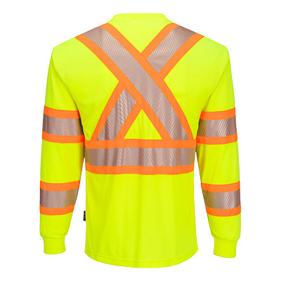 This Hi-Vis X Back Long Sleeve T-Shirt uses a lightweight moisture wicking polyester fabric for breathability and comfort. Features include contrast segmented tape for high visibility in a H-tape on the front and a X Back formation on the back, a crew neck, a taped neck seam for extra comfort.
